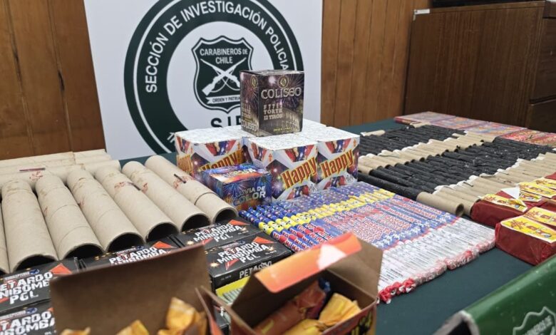 En el detalle, el decomiso corresponde a 6 cajas de fuego de artificio denominado tortas, 12 tronadores, 42 palmeras, 23 candelas, 19 metralletas, una caja de lluvia de color, 78 pilas, 10 doritos, 96 estrellitas y 2 cajas megatón.