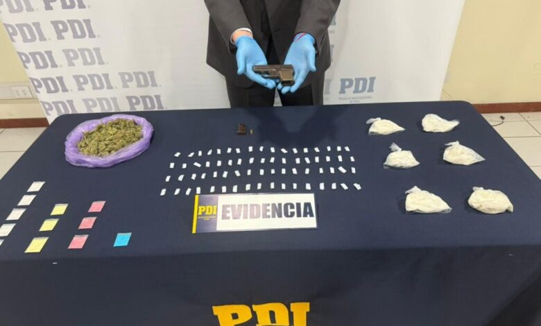 En el lugar, detectives lograron detener a una mujer chilena, mayor de edad, quien mantenía en su poder un arma de fuego, municiones y diversas drogas, entre ellas cocaína base, cannabis y ketamina. Todo ello fue incautado en el procedimiento.